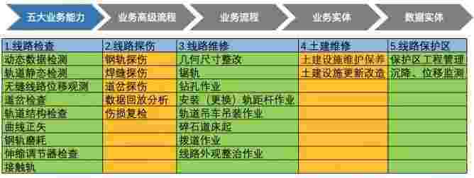 在轨道运维业务中,,,,,,我们形成了完整的从业务能力(业务域)-业务流程-业务实体-数据模型的分析梳理过程。。。。。。。。。轨道运维业务能力如下图所示:::::