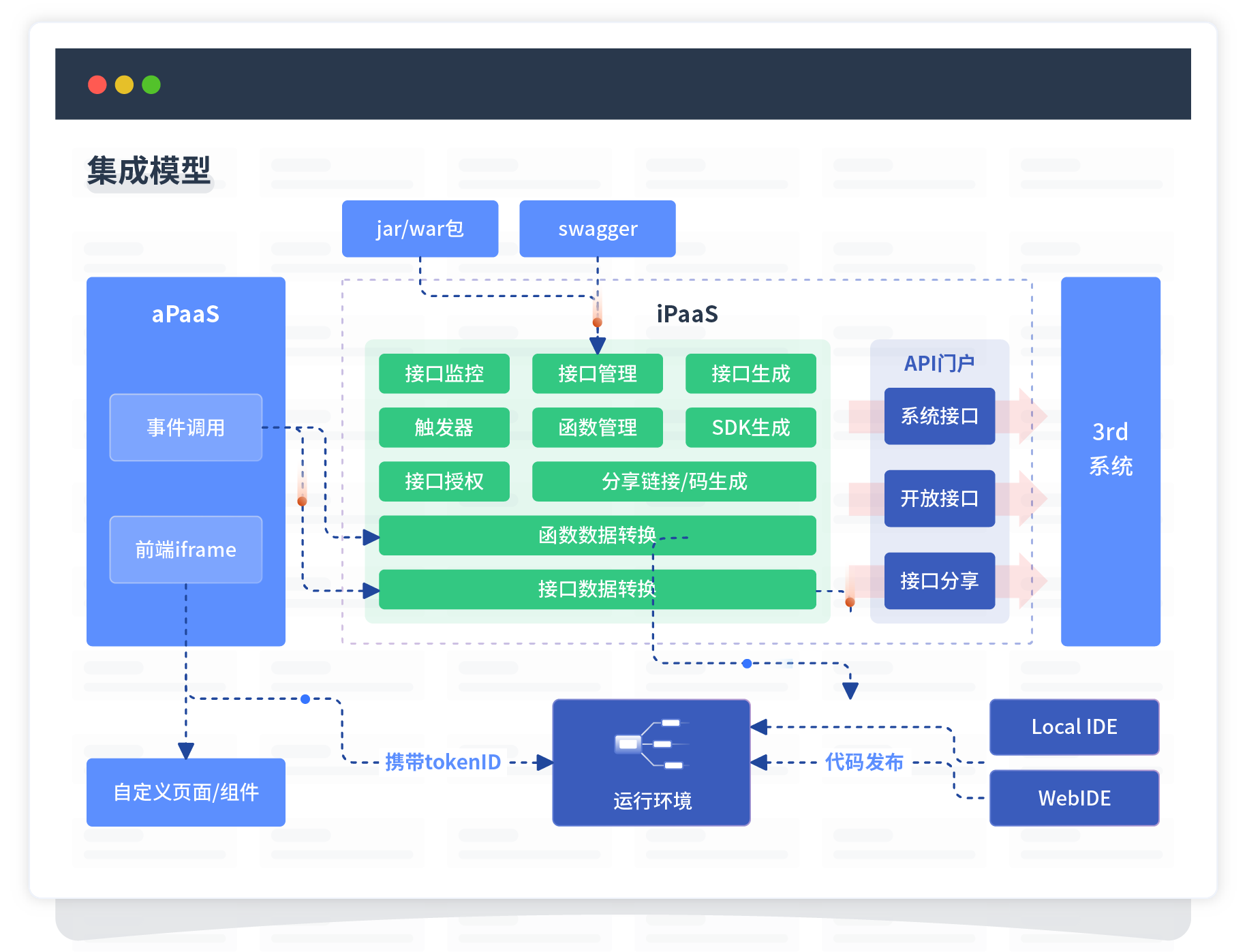 集成模型包括平台本身前、、、、、、、、、、后端能力的扩展,,,,,,,,也支持通过API门户和第三方系统进行交互。。。。