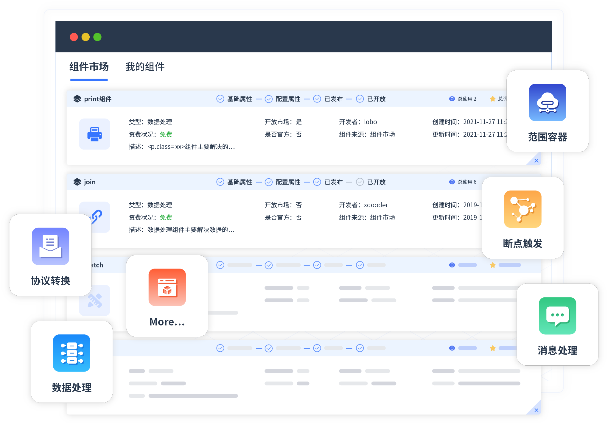 针对集成场景,,,,,,,小微钱包提供组件市场,,,,,,,,,例如协议转换、、、、、、、、、、、、、、消息处理、、、、、、、、、、、、、、、、文件操作等。。。。。。。。。。。。除平台提供的组件外,,,,,,,,,,,,,,客户可以自定义所需组件。。。。。。。。。。。。。