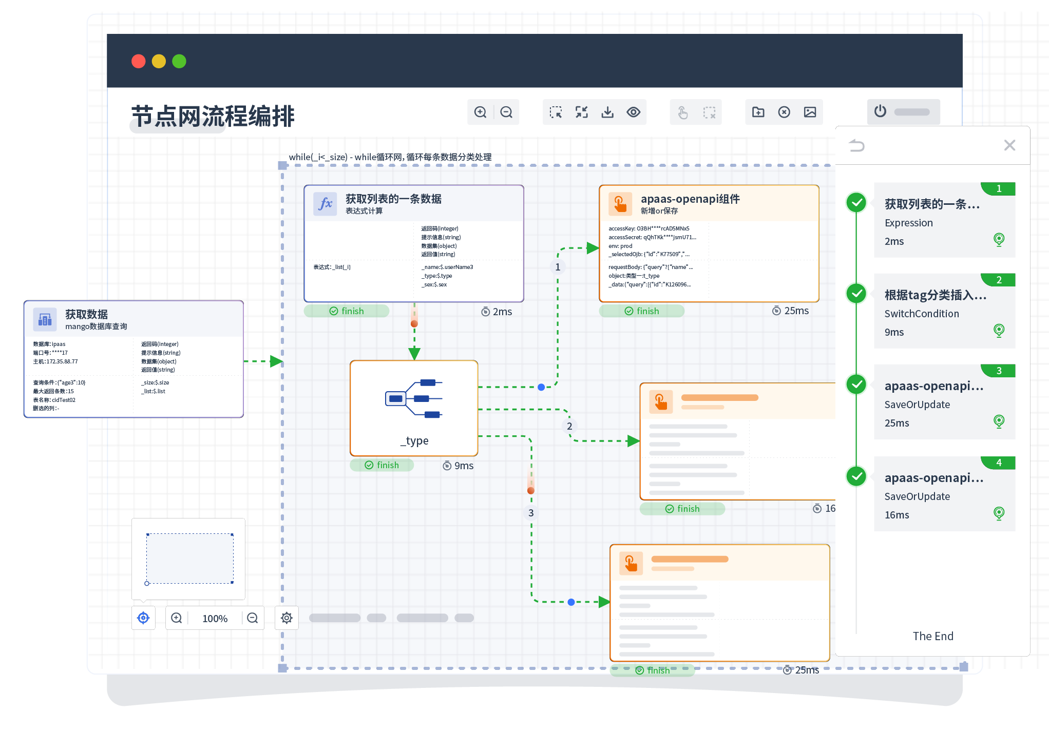 针对集成场景,,,,,,,,组件定义后支持进行流程编制,,,,,,,,,,,,,,不同于传统代码方式,,,,,,,,,,,,,,,通过图形化展示,,,,,,,,支持在线调试、、、、、、、、、、、、日志查看和运行回放。。。。。。。