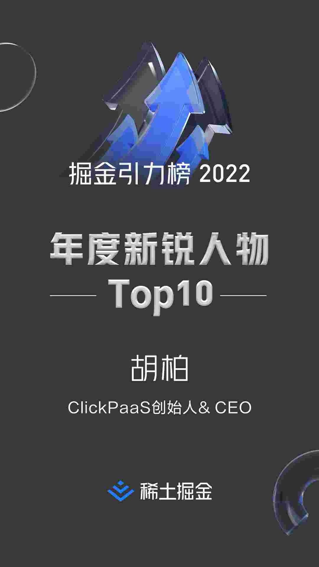 2022年1月6日,,,,,,,,稀土掘金社区第一届「掘金未来大会」成功举办,,,,,,,,,,,会上发布了“2022 稀土掘金引力榜 年度新锐人物”榜单,,,,上海爱湃斯科技有限公司(简称小微钱包)创始人及CEO胡柏实力入选年度新锐人物TOP 10。。。。。。。。。