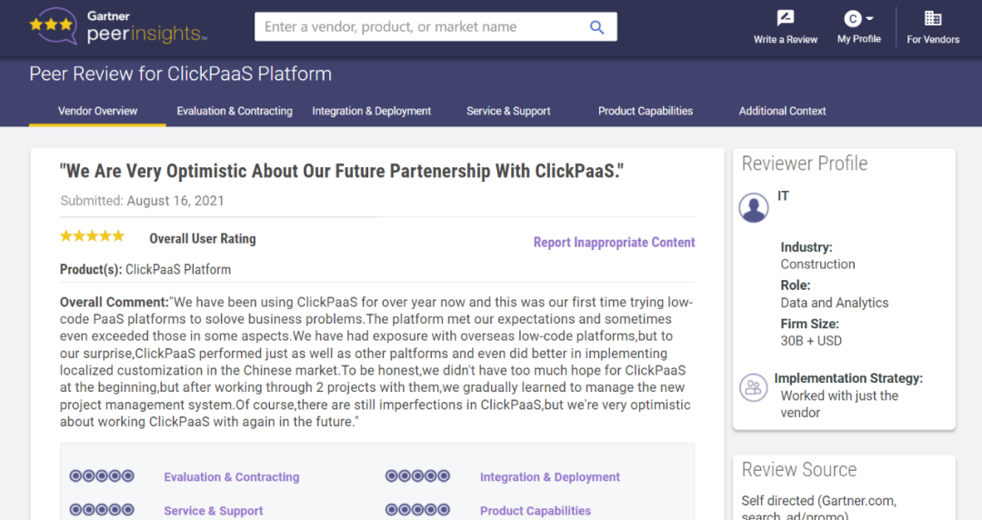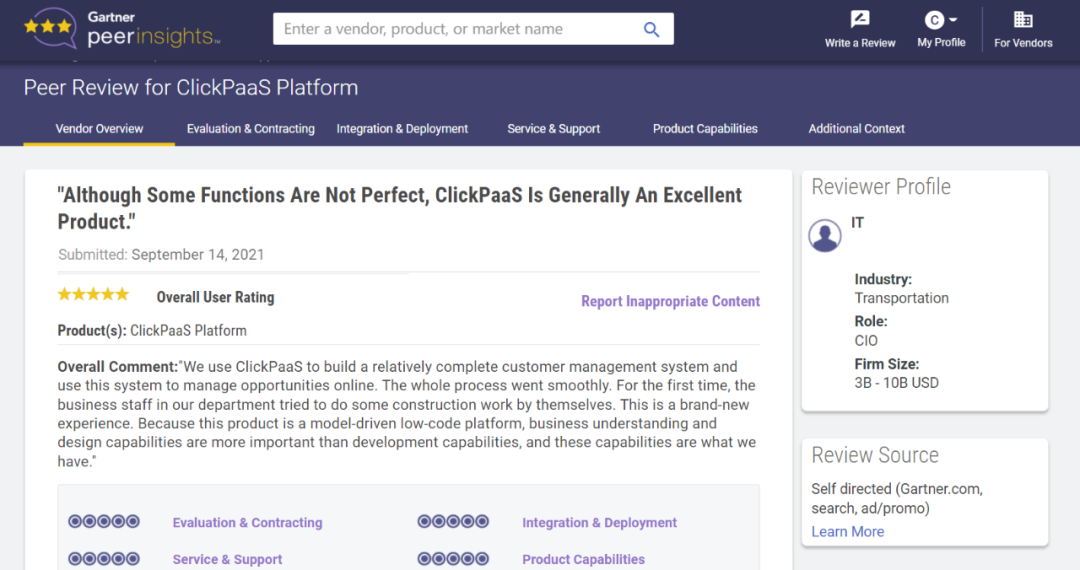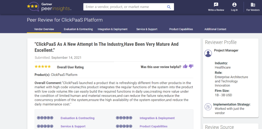 Tips:::::::【Peer Insights】——用户对企业IT产品和服务发布真实评价的平台。。。。。。。。。。目前已有355个市场,,,,,,,,,255,000条经过验证的评价。。。。。。。。。每一条评价Gartner会针对参评企业营收规模及参评人员信息做验证、、、、、、、、、、、评价内容做多维核实。。。。。。。。。。。